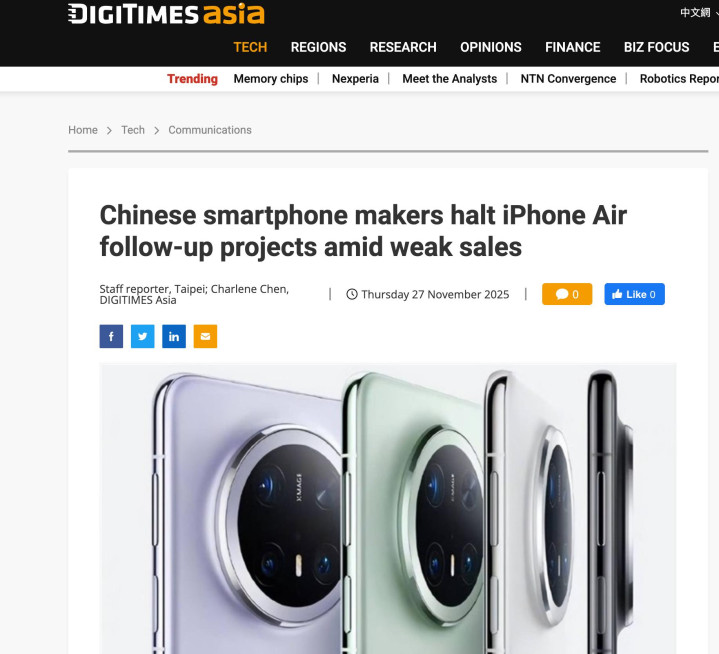 然而现实并不如预期,上市不过两个月,iPhone Air 的市场表现就被普遍认为“不及格”,甚至连带让整个行业对 Air 轻薄机这条路产生了动摇。