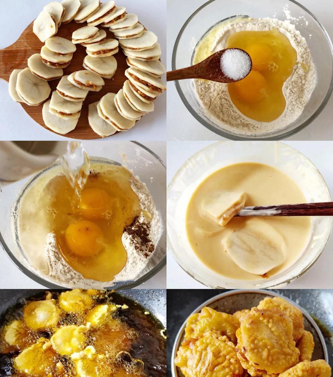 3.土豆盒子裹上面糊,就像给它们穿上金黄色的外衣。