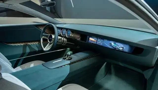内饰方面新车采用了全新的布局风格,尤其是左侧皮革材质包裹的三幅式多功能方向盘和前方的三个圆形仪表盘都颇有复古的感觉,中控显示屏和副驾驶娱乐屏组成了一体式设计,同时新车还取消了物理按键,加上下方造型精致的挡把机构,整体科技效果还是很强的。